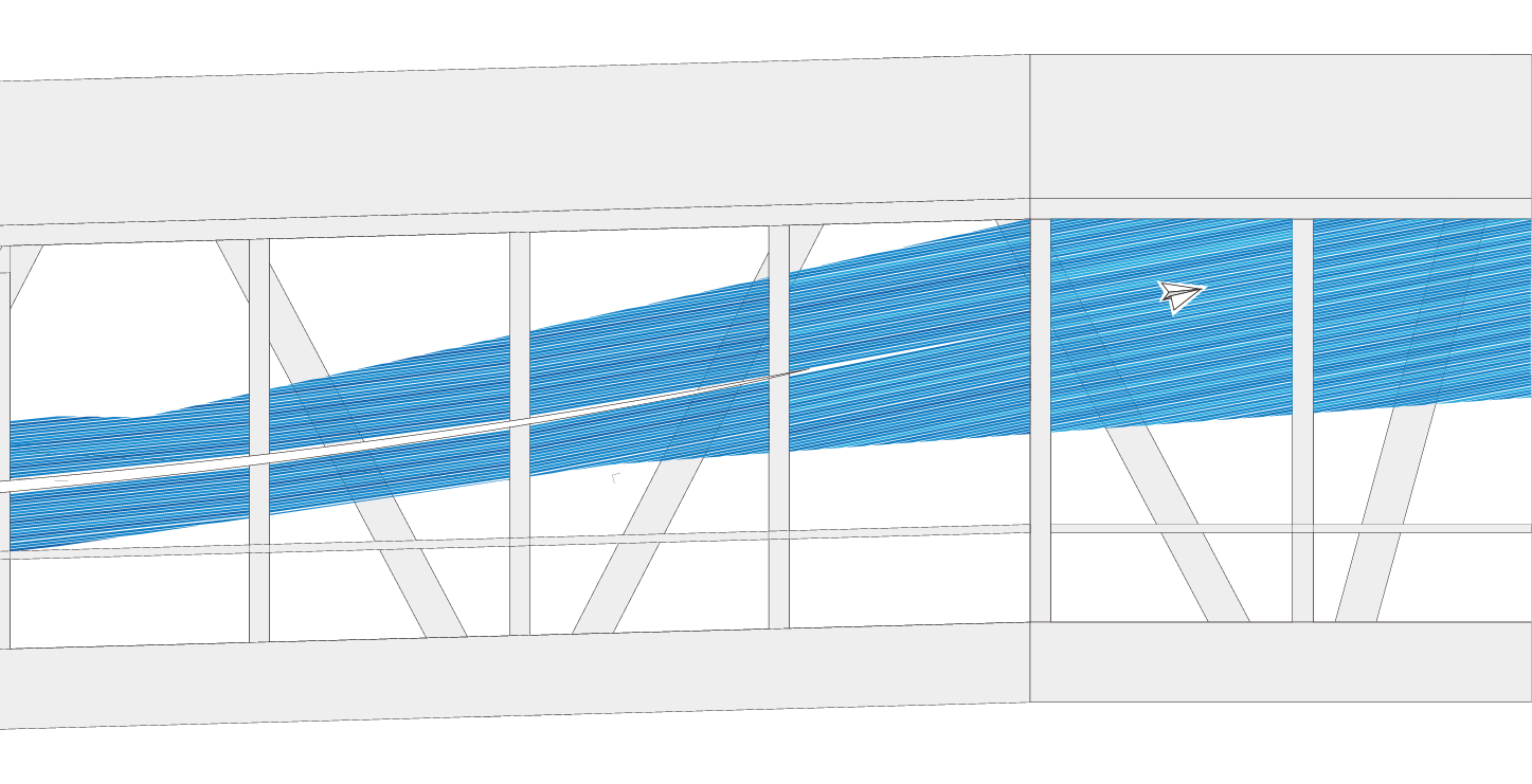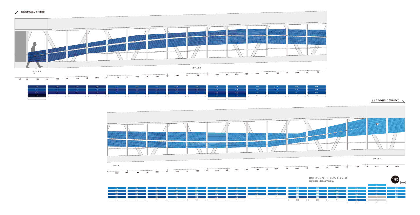 私は、誰かから誰かへ、誰かから青空に向けた思いを載せた紙飛行機と飛行機雲の装飾デザインを制作した。内側至近から見ると、進行方向に青い細いラインの中に白い太いラインが続く。この先に何が続くんだろうという好奇心。最後に紙飛行機が飛ぶことで爽快感を与え、なるほどこれは青空で飛行機雲だったのかという納得感も与える。さらに外側遠距離から見ると青色の美しいグラデーションにスーーと紙飛行機が飛んでいてとても美しい青空を見上げることができる。