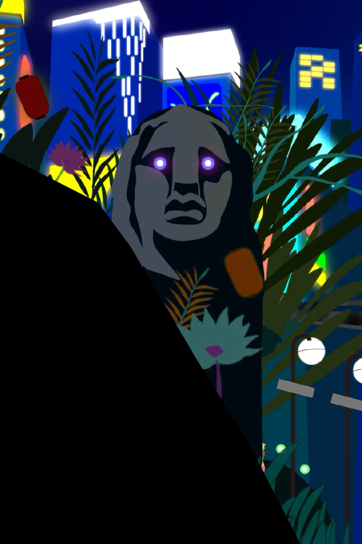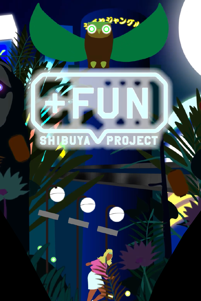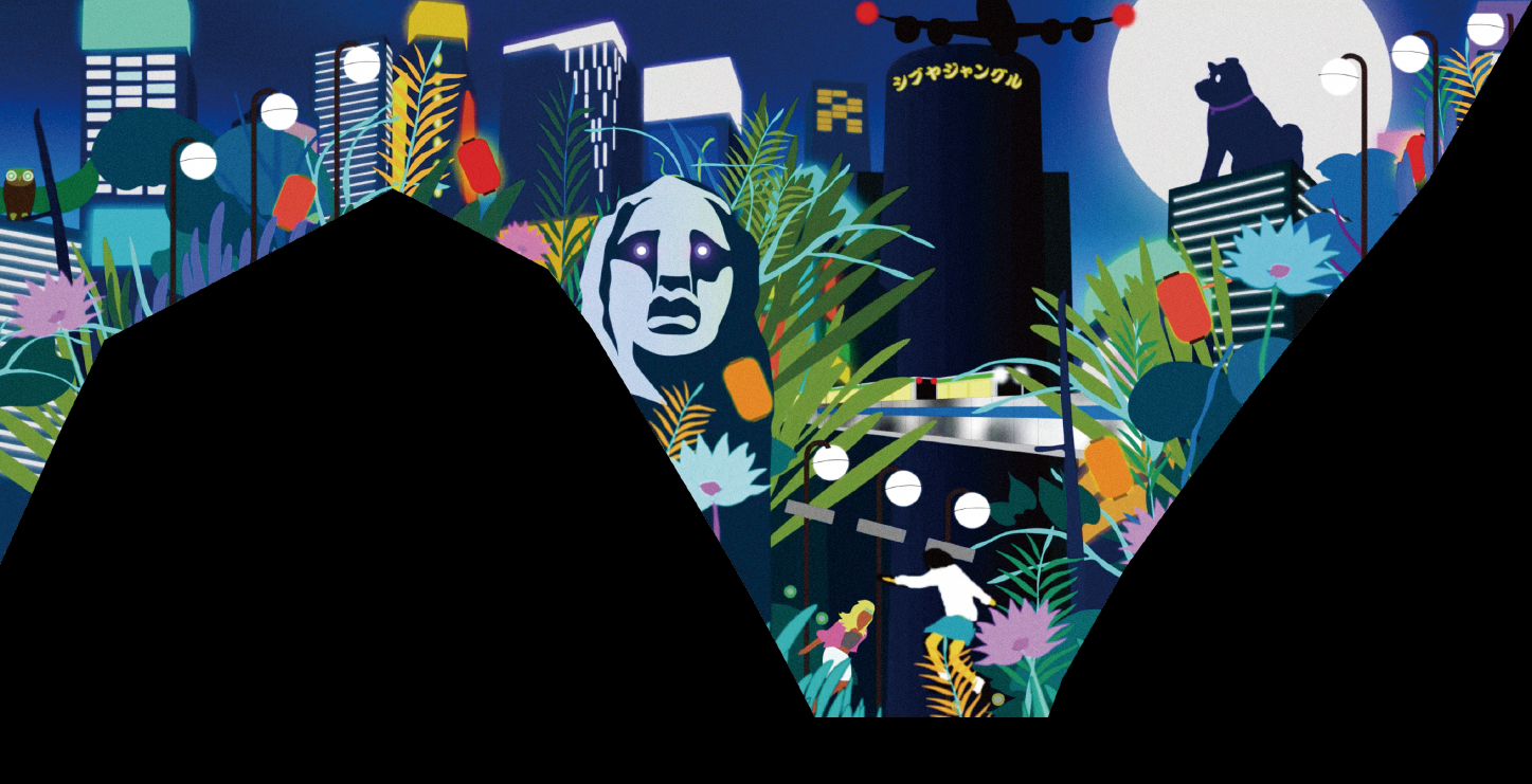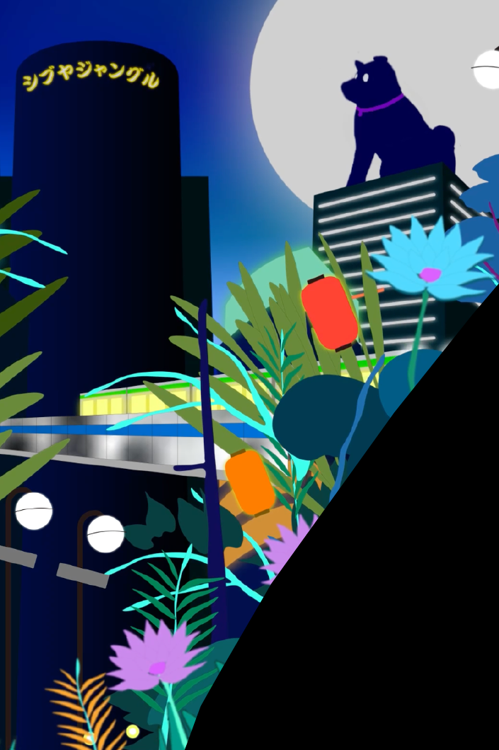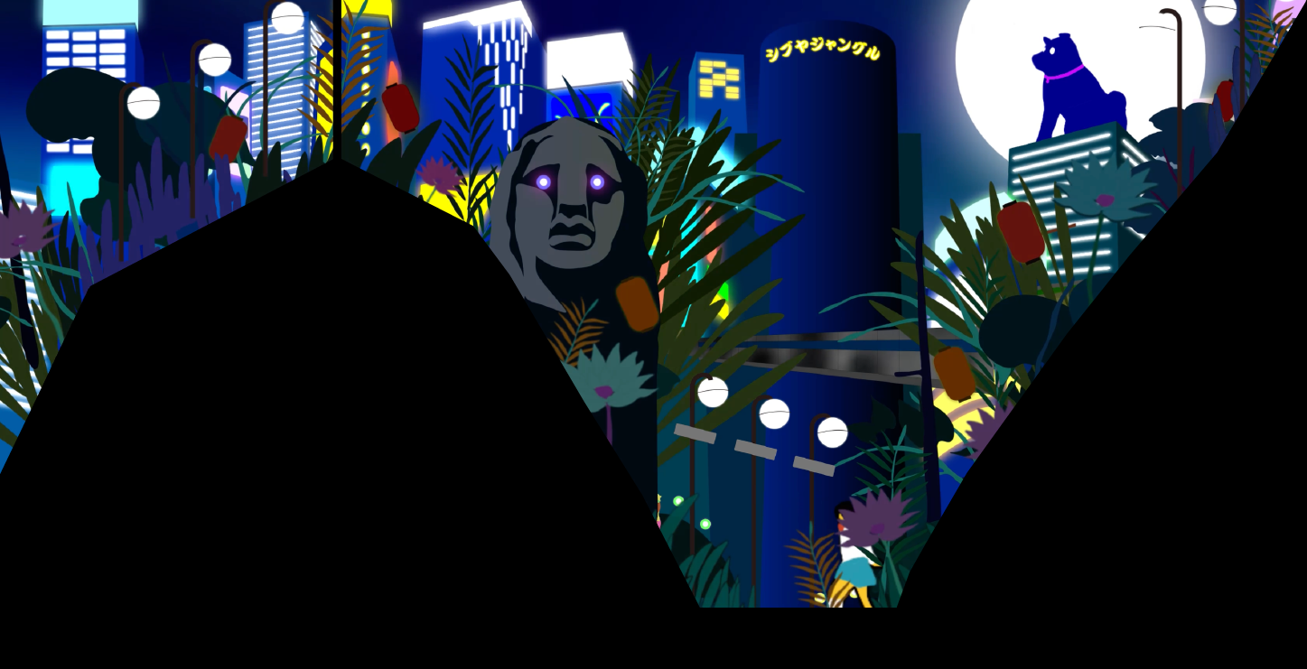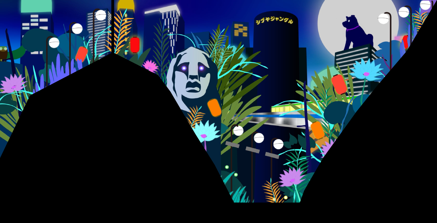 2024年4月から1年間、渋谷スクランブルスクエア大型ヴィジョンで放映される15秒のモーショングラフィックスの制作を行った。何度訪れても未知なものが発見できる渋谷。その得体の知れなさが魅力であると考え、渋谷の街をジャングルとして捉えた表現を行った。ジャングルらしい擬音語、「カサカサ」「ギョロギョロ」「パチパチ」などと渋谷を構成する要素、「モヤイ像」「ハチ公」「ホープ君」などを掛け合わせた。また、映像の大半が静止画となりその中でキャラクターたちが動き、まるでジャングルの中に迷い込み何かに見られている感覚を目指した。映像にはたくさんのキャラクターたちが潜み、何度見ても新しい発見がある、まるで渋谷のように得体の知れなさが魅力の作品となっている。
